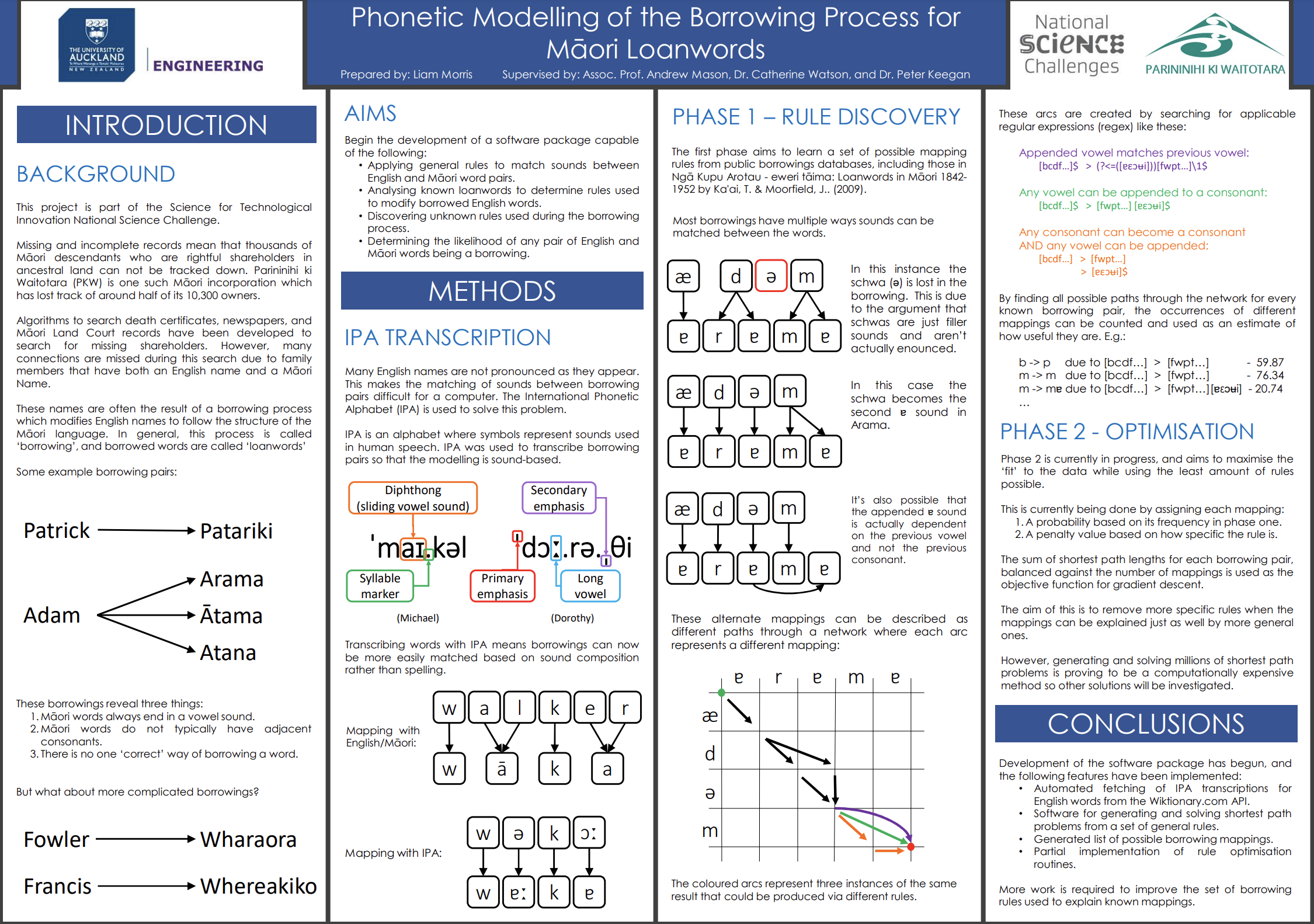 This project is part of the Science for Technological Innovation National Science Challenge. Missing and incomplete records mean that thousands of Māori descendants who are rightful shareholders in ancestral land can not be tracked down. Parininihi ki Waitotara (PKW) is one such Māori incorporation which has lost track of around half of its 10,300 owners. Algorithms to search death certificates, newspapers, and Māori Land Court records have been developed to search for missing shareholders. However, many connections are missed during this search due to family members that have both an English name and a Māori Name. These names are often the result of a borrowing process which modifies English names to follow the structure of the Māori language. In general, this process is called ‘borrowing’, and borrowed words are called ‘loanwords’ Some example borrowing pairs: